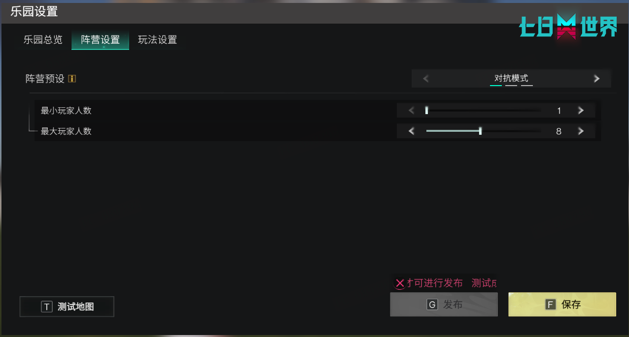 超越者可以修改玩法的阵营模式和参与人数,阵营分为对抗、合作、合作对抗,也可以自定义最大、最小的参与人数。