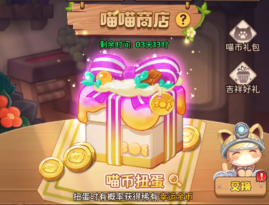 银币可用于喵币扭蛋,除获得常规奖励外,扭蛋时还有概率获得更为稀有的喵喵的幸运金币,两种货币可在特卖品专区中购买不同级别的特卖品。