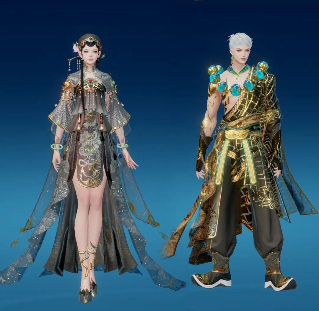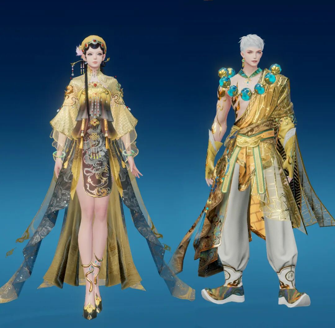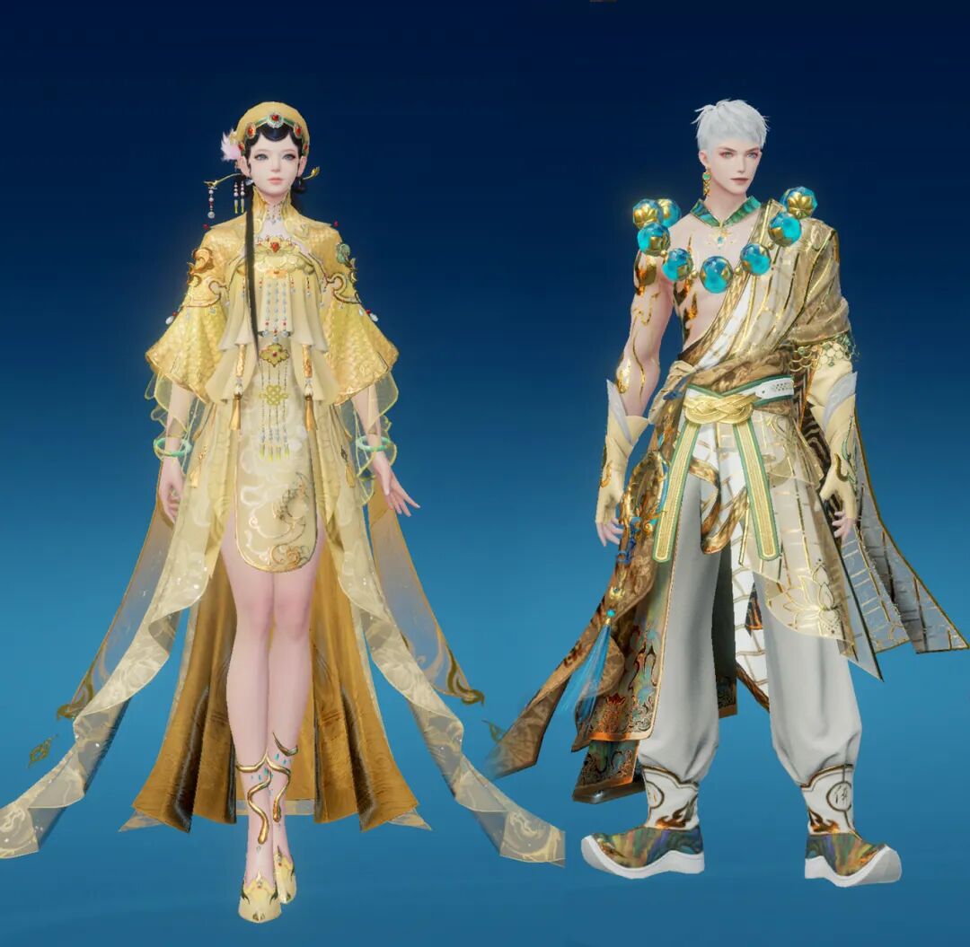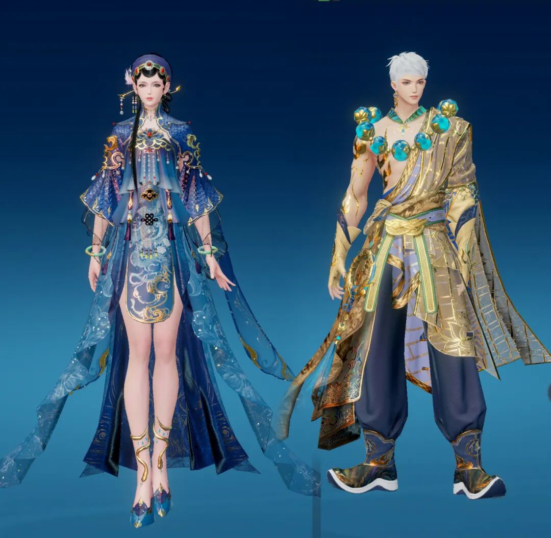 男款发型设计别出心裁,一头利落的白色短发,给人以冷冽、神秘之感。上身袒露,健壮的身形展露无遗,金色的纹身如灵蛇般蜿蜒于肌肤之上,增添了几分野性与力量感。脖颈间佩戴着精致的项链,搭配肩部那串由蓝绿宝珠串成的饰品,宝珠圆润且色泽温润,与金色元素相互映衬,奢华中不失灵动。