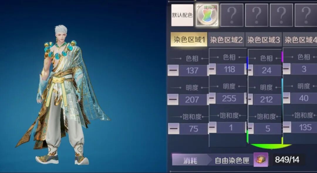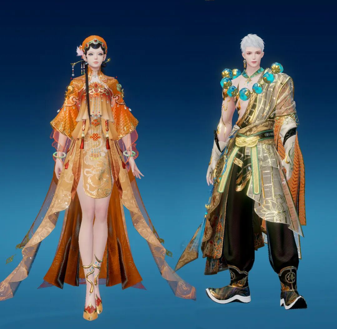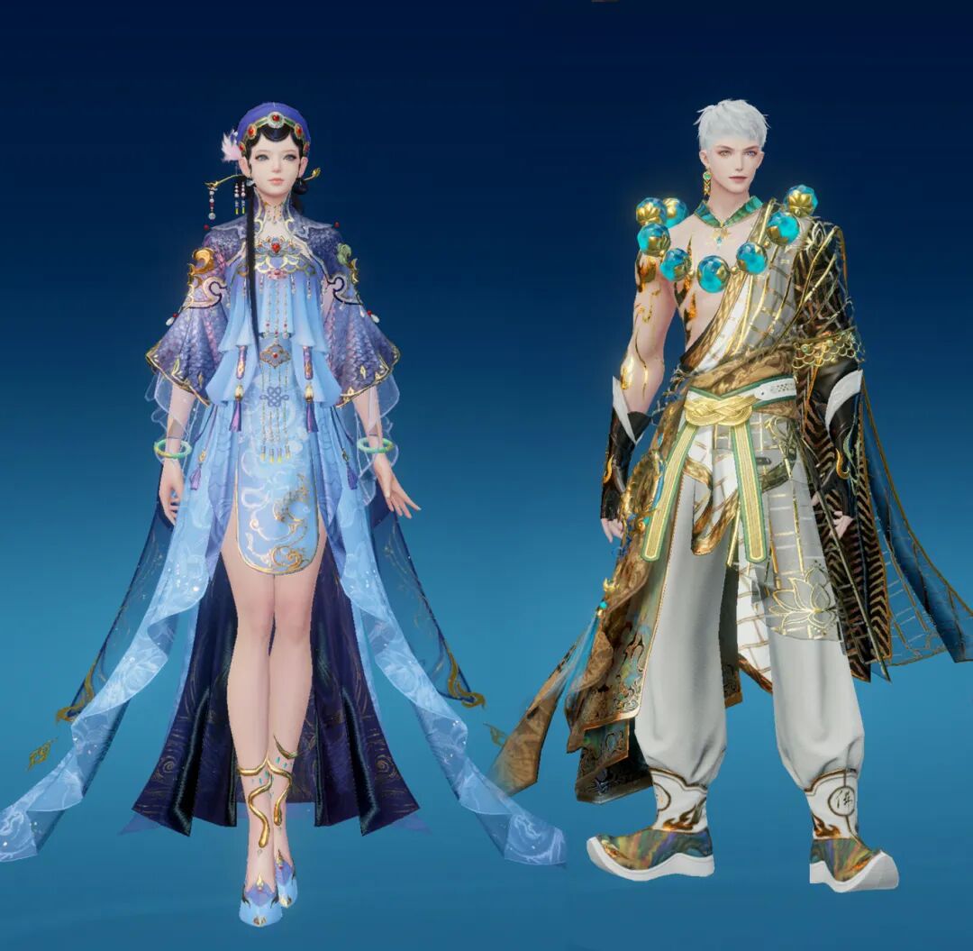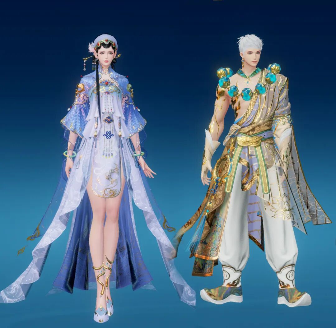 男款发型设计别出心裁,一头利落的白色短发,给人以冷冽、神秘之感。上身袒露,健壮的身形展露无遗,金色的纹身如灵蛇般蜿蜒于肌肤之上,增添了几分野性与力量感。脖颈间佩戴着精致的项链,搭配肩部那串由蓝绿宝珠串成的饰品,宝珠圆润且色泽温润,与金色元素相互映衬,奢华中不失灵动。