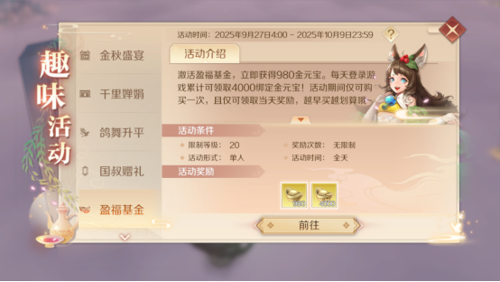 福利详情:只需激活基金,就能立刻获得980金元宝!之后每天登录游戏,还能持续领取绑定金元宝,累计可领高达4000绑定金元宝!