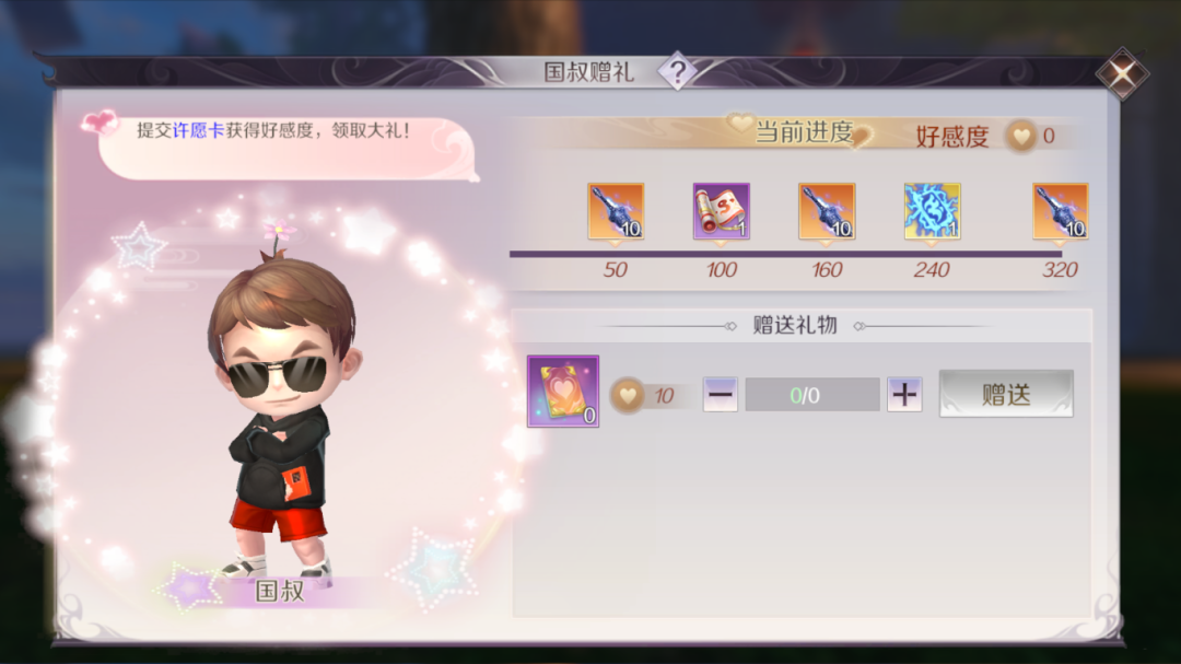 收集了那么多“许愿卡”,该去哪里兑现呢?我们和蔼可亲的“国叔”正在祖龙城北等着大家!把【许愿卡】送给他,就能提升好感度。当好感度达到指定值后,国叔就会送出珍藏的豪礼!