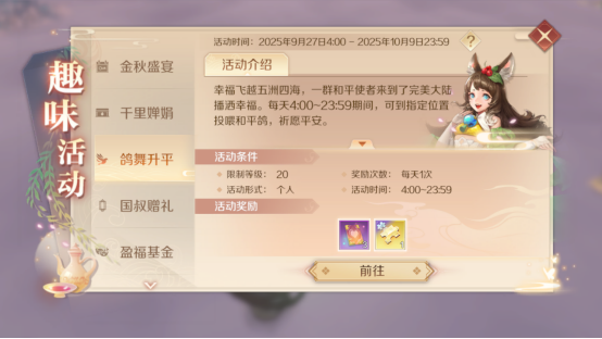 “咕咕咕~” 一群可爱的和平使者来到了完美大陆,它们象征着幸福与和平。活动期间,修真者可以前往指定地点,寻找并投喂这些可爱的小鸽子,不仅能为大陆祈愿平安,还能获得奖励哦!