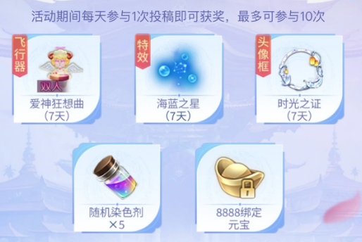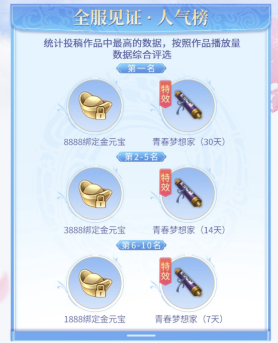 最终人气榜单,将根据修真者们发布的作品播放量等综合数据评选,最高可领取8888绑定金元宝&特效-青春梦想家(30天)。