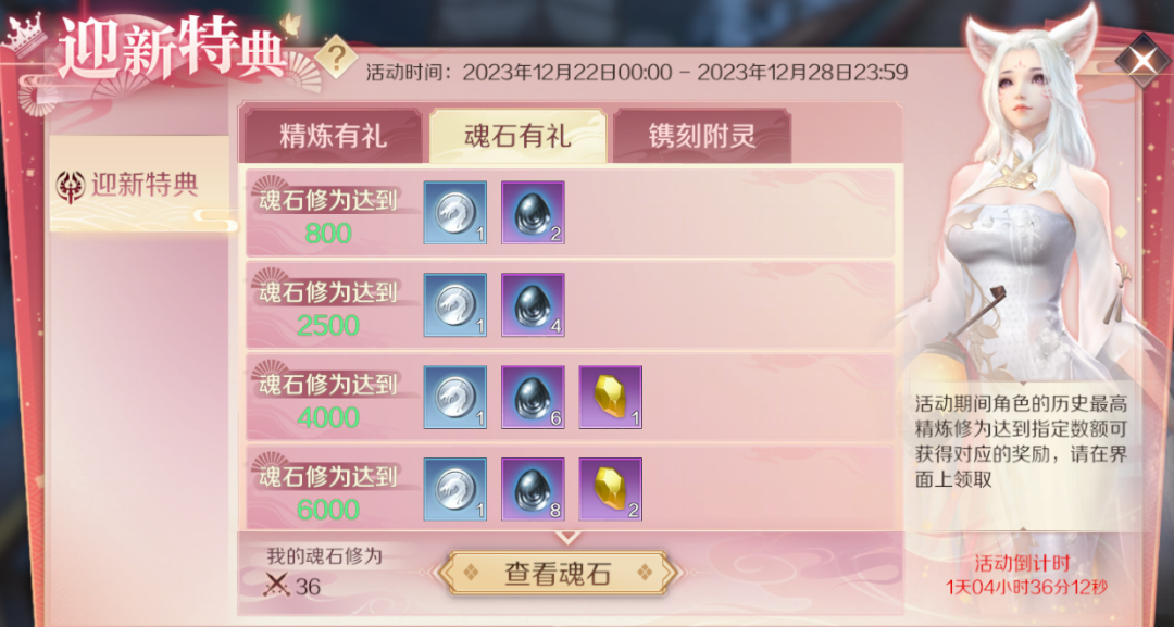 迎新特典活动将持续7天。在精炼有礼和魂石有礼、镌刻附灵中,修真者在活动期间,精炼修为以及魂石修为达到指定数额则可获得对应的奖励,超多银币、乾坤石等道具福利等你领取。