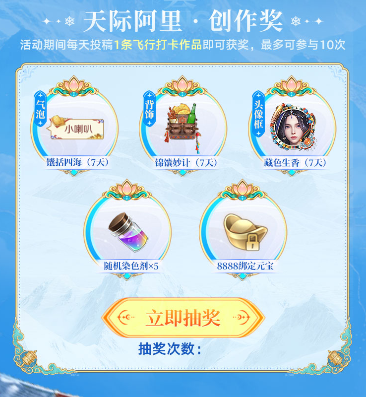 只要你脑洞够大,素材够多,海量福利等你来拿!活动期间,每天投稿1条飞行打卡作品即可获奖,最多可参与10次!