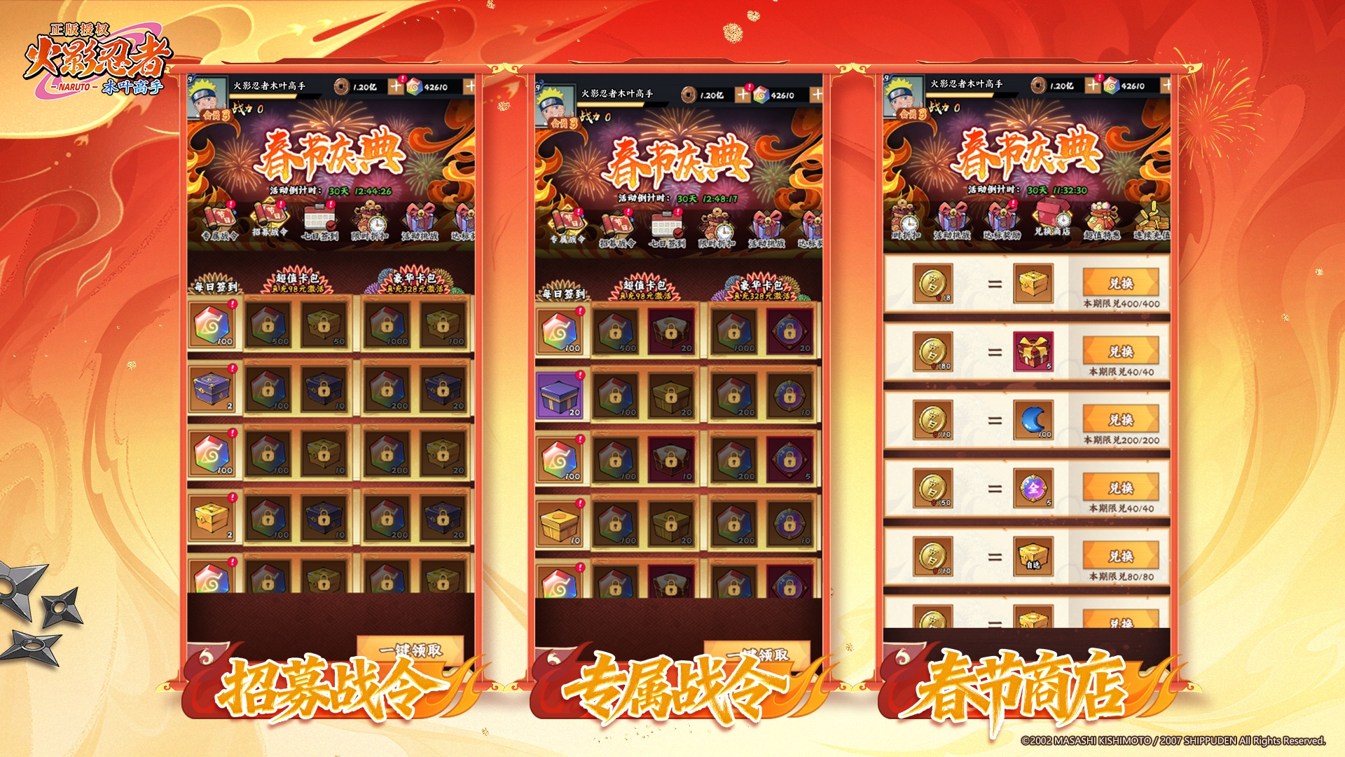 忍者挑战:闯关试炼开启,通关解锁新春好礼!春节庆典期间限时开启忍者挑战关卡,每一关都有专属的战力门槛与战斗考验,通关即可解锁新春「红包」、「节日币」等实用奖励。关卡层层递进,福利也随之升级,只要你的战力达标就能即刻开启挑战,在闯关实战中检验忍道成果,赢取专属新春好礼!