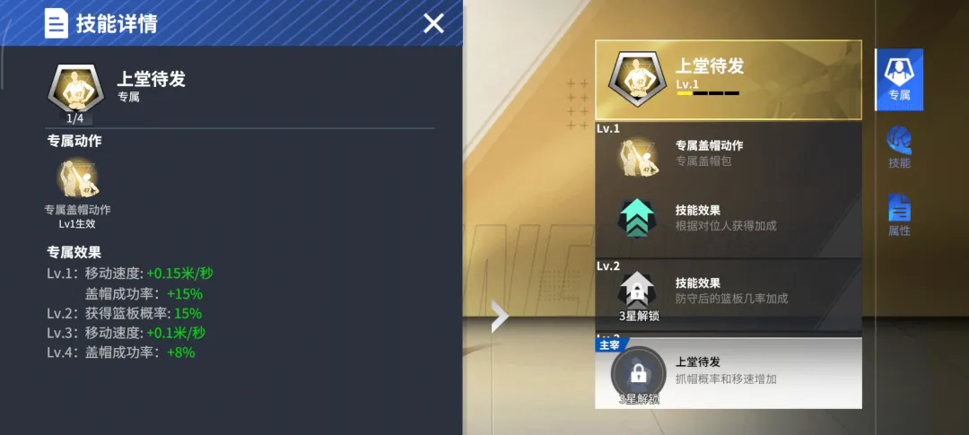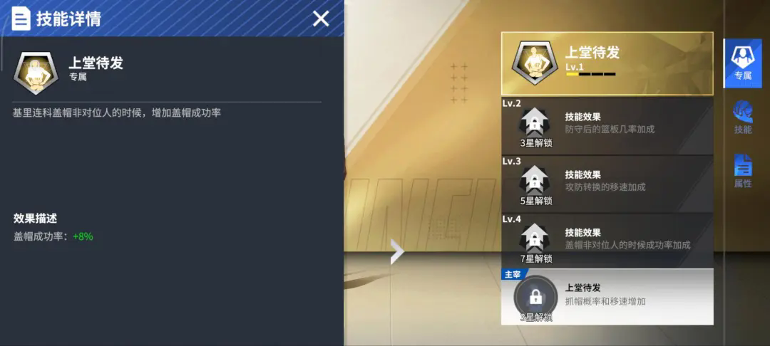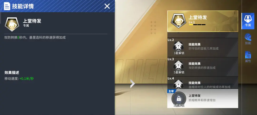 1级专属提升基里连科的机动性!无论是灵活的后卫还是强硬的中锋都能无差别单防!当对位人的三分+中投属性比扣篮+力量篮高的时候,获得移动速度+0.15%/秒的加成!反之获得盖帽成功率提升15%加成!若相等,则随机获得一项增益!