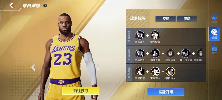 可增加力量脚踝概率15%,同时额外提升力量脚踝概率8%并解锁动作折叠背扣。想防守詹姆斯,在防守技巧足够好的同时也要面板数值够硬,不然只能望洋兴叹;二级