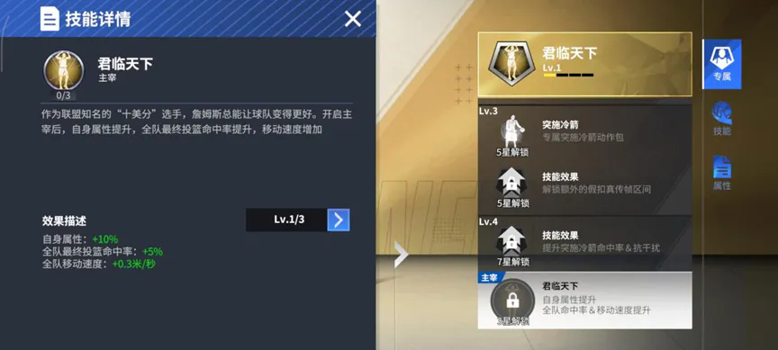 自身属性增加10%,全方位无死角提升完全挑不出詹姆斯的短板;全队最终投篮命中率提升5%与全队移动速度增加0.3米/秒,全民皆兵,跟随你们的皇帝向着最后的胜利冲锋!