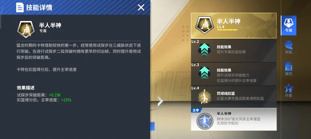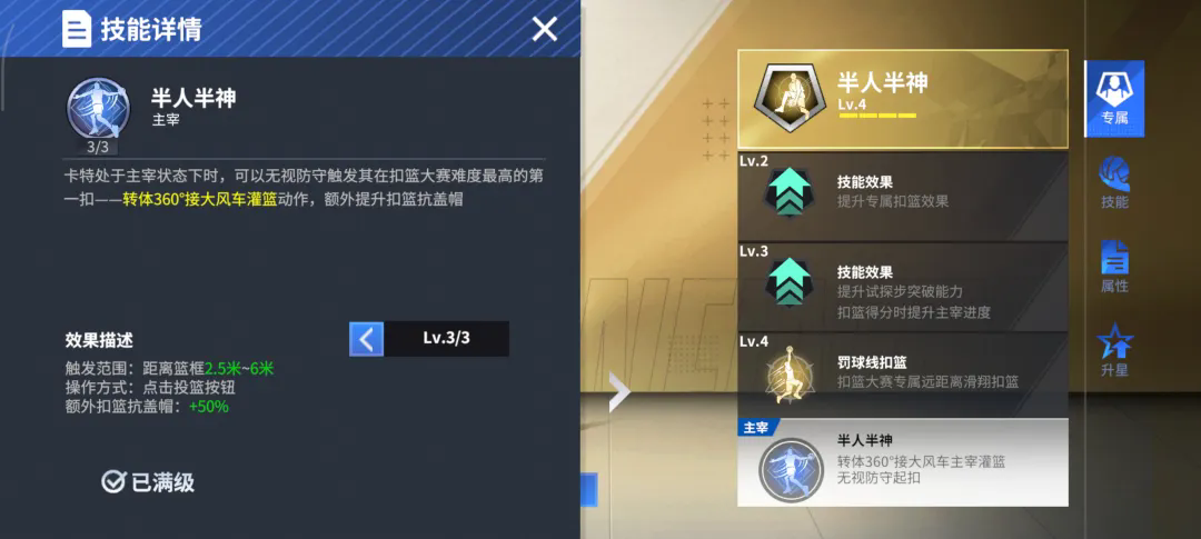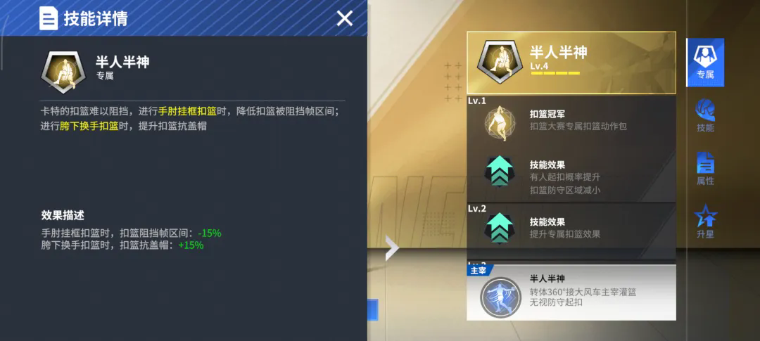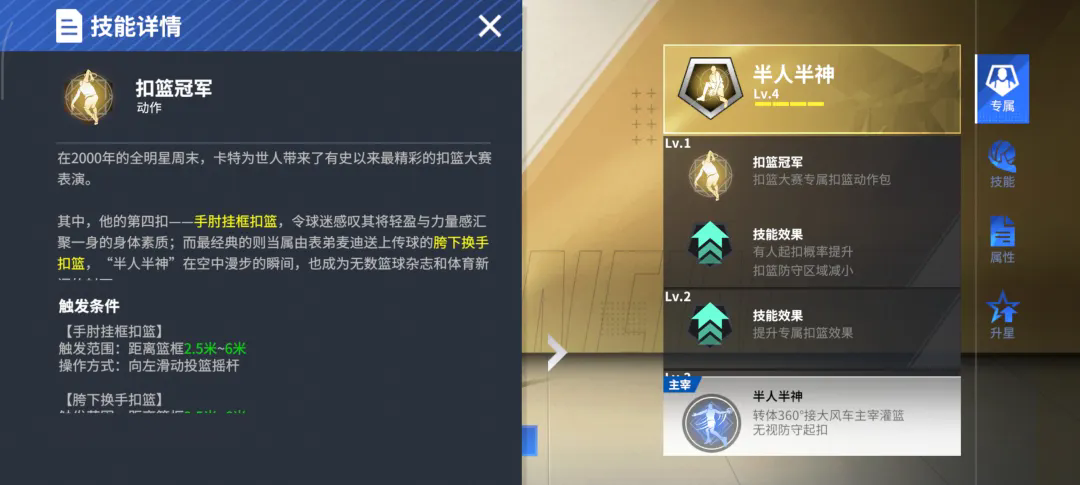 在游戏里,卡特的扣篮造诣也遥遥领先绝大多数扣将,五级空中飞人&五级隔扣达人&五级空中作业,让卡特在篮筐之上尽情书写暴力美学,配合空中接力,队友助攻的每一颗球都能让卡特用扣篮点燃全队的激情。半人半神的外号并非浪得虚名,试探一手后弹射起步,突破距离+0.2米,结合多重扣篮动作所带来的增益,对方无法猜测卡特会用何种扣篮来发起进攻,就算猜到,额外减少的扣篮阻挡帧区间与提升的扣篮抗盖帽,也极大提高卡特的扣篮容错率,这便是扣篮天才的造诣!
