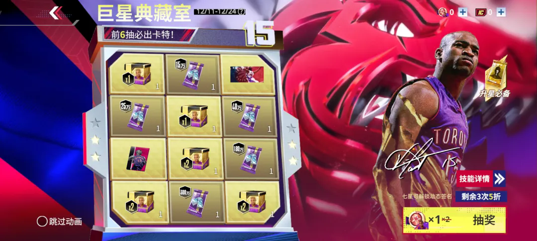 兄弟们,12月11日-12月24日,典藏卡特限时返场!吉哥还带了点心意:前3抽半价,4-6抽可享9折优惠!上次错过了,这次吉哥真要出手了,抓住青春的回忆,感受极致的扣篮美学!