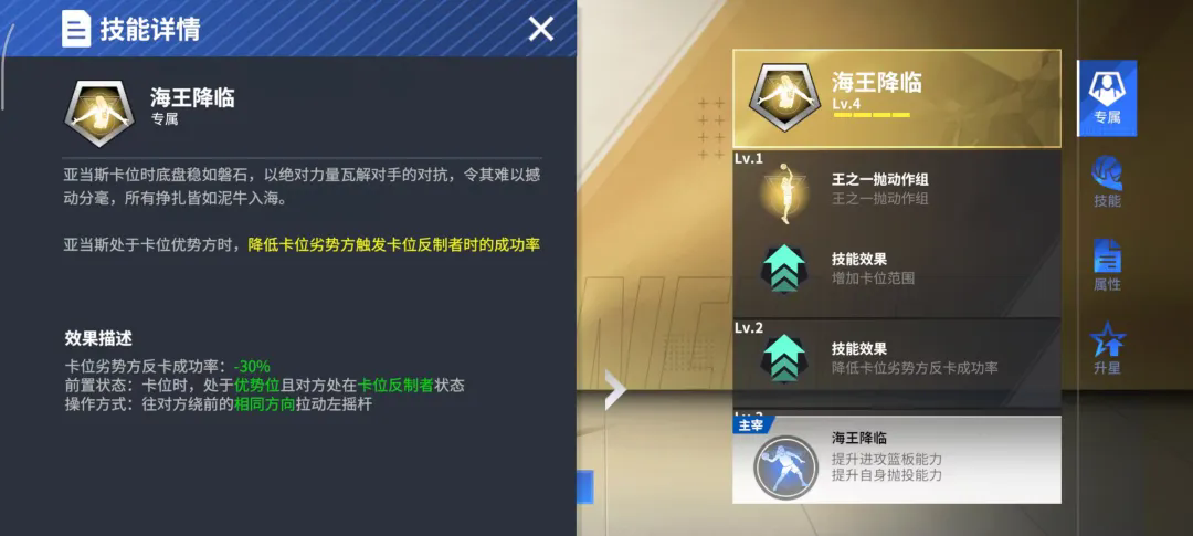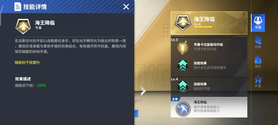 亚当斯的专属主宰:海王降临!增大触发专属抛投动作的判定范围至油漆区内,且增加20%自身争抢进攻篮板成功率。需要我单打那我就再露一手小抛投,队友手感欠佳时,我还有额外20%的抢板成功率,这样优质全面的夺冠帮手谁不爱!