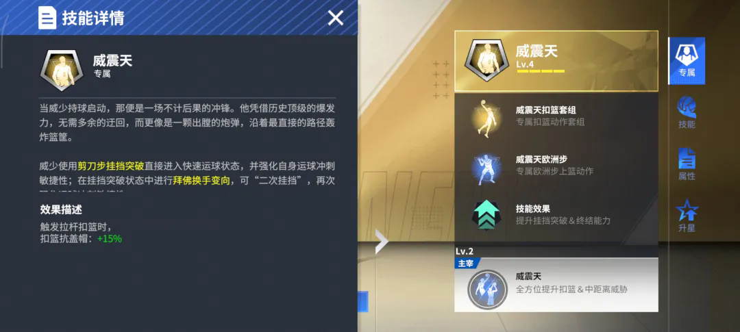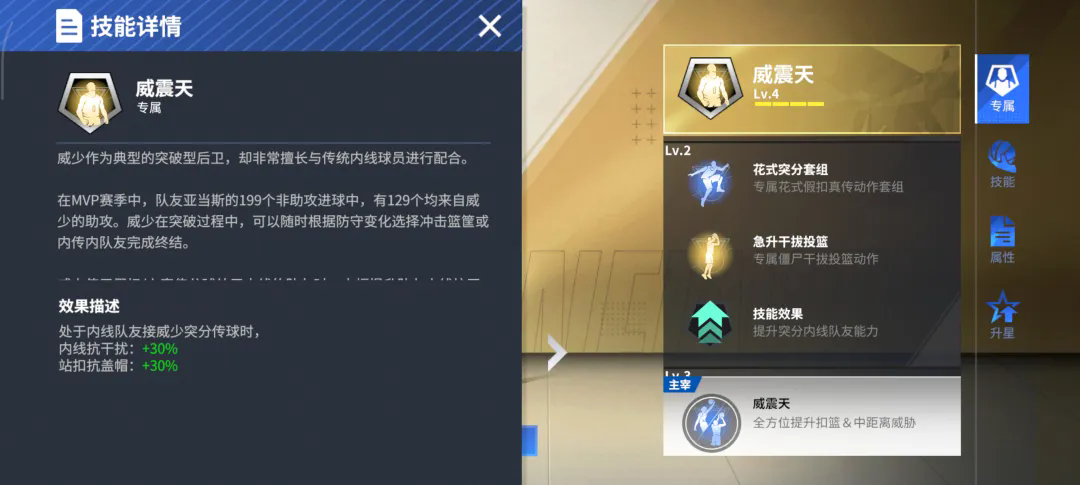 如果威少的面板已经让你感受到了他的全能,那么威少的技能与动作将会全方位征服你!五级空中飞人&五级第一步大师&五级篮板精英&五级加速大师,持球在手,威少起飞只是时间问题,完全不需要考虑对方防守阵容!五级隔扣达人&五级传球杂耍者+五级关键先生,全方位无死角拉满处理关键球能力!是的,能投能打还能传,数据动作全包揽!补扣,底线扣,拉杆扣,抛投,超远上篮……如果你没见过进攻百科全书,那你看威少操作就够了!不惧防守,进攻全是技巧,你的防守在第三层,威少的进攻在第五层!