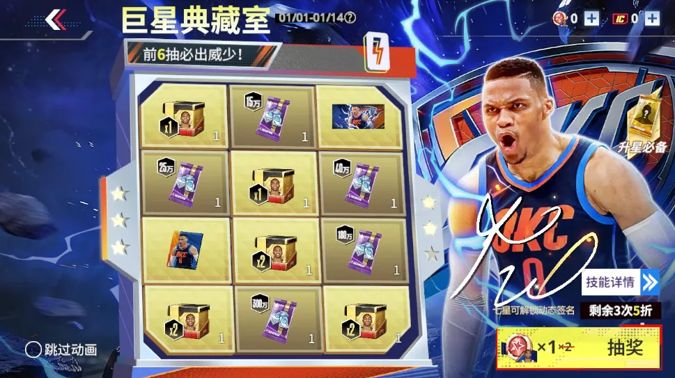 吉哥还有一件事向大家宣布,新赛季登陆巨星典藏室的威少有福利活动!前3抽半价,4-6抽可享9折优惠!降低入手门槛!冲就完事了!