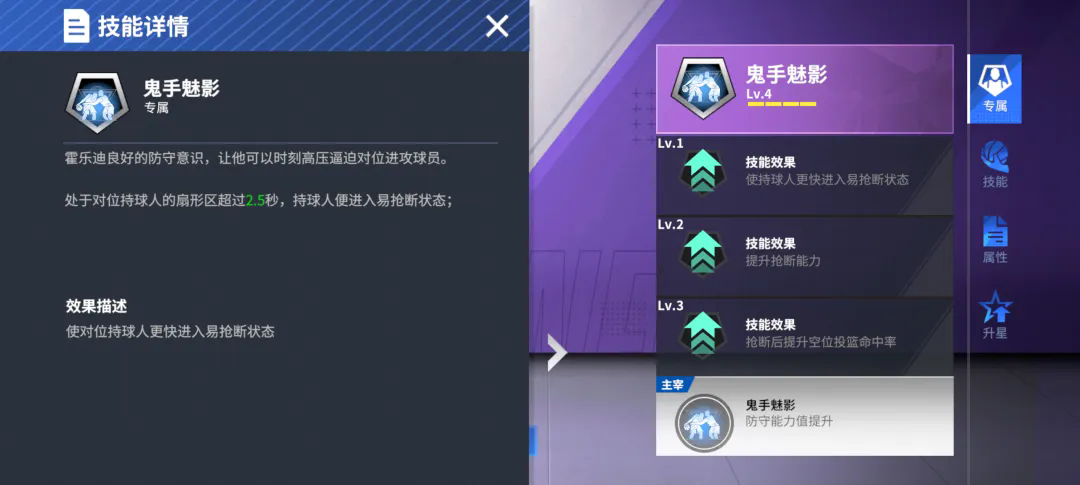 1级专属调整:待在对位持球人扇形区超过2.5s出易抢断,并移除“比赛时间最后30s将该BUFF赋予到队友身上”的效果。