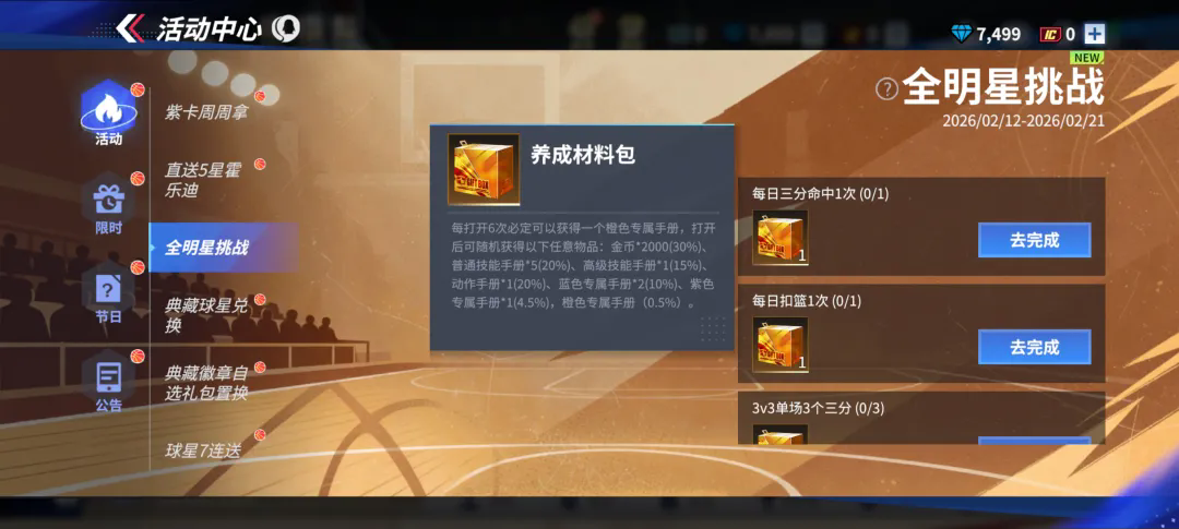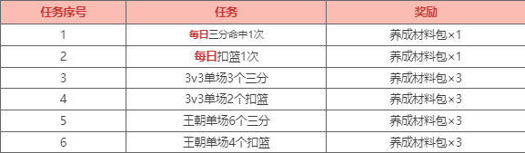 在3V3和王朝模式中完成指定挑战,获得养成材料包奖励!打开养成材料包随机获得以下任意物品:橙色/紫色/蓝色专属手册 、动作手册、高级/普通技能手册、2000金币。本挑战赛具有新春福气加成!每打开6次必得橙色专属手册!
