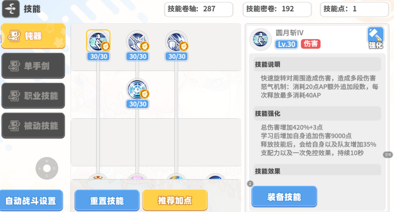 根据职业所持有的武器,可学习对应的技能,转职后可以学习更高级的职业技能 技能分:主动技能、职业技能、被动技能