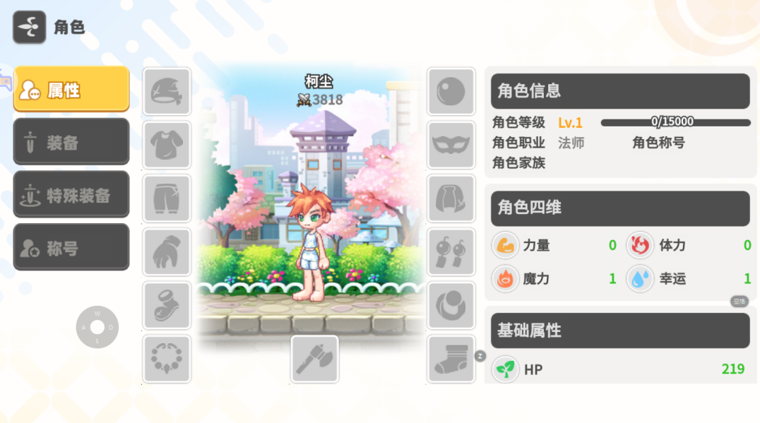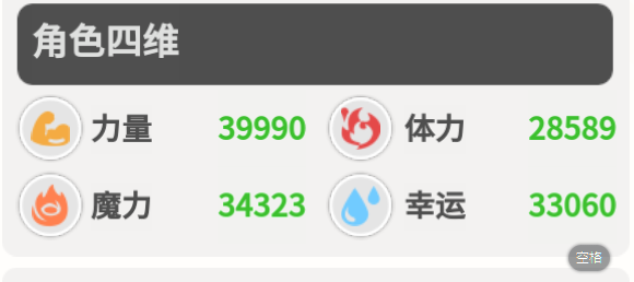 攻击(战士的核心属性,决定物理伤害),魔法(决定魔法伤害),敏捷(决定精准度),运气(暴击伤害),生命值,魔法值