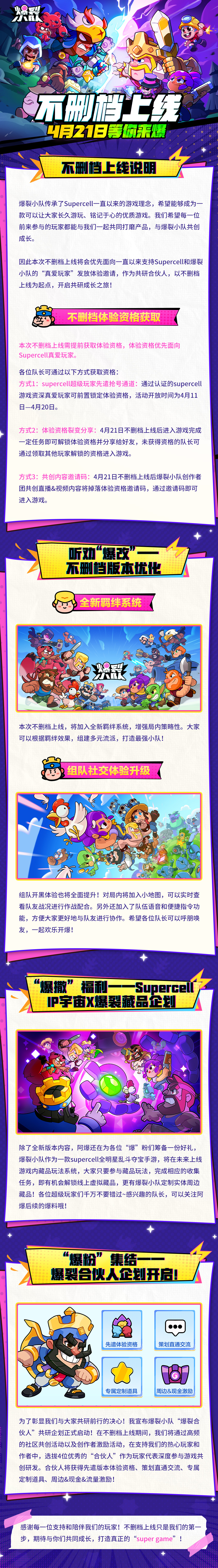 本次不删档上线将会优先面向一直以来支持Supercell和爆裂小队的“真爱玩家”发放资格,作为共研合伙人开启共研成长之旅!目前supercell超级玩家专属资格邀请通道现已开启,赶快来验证锁定资格吧!