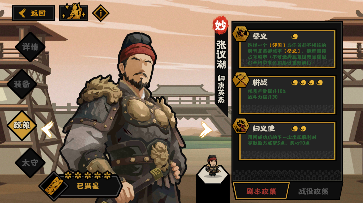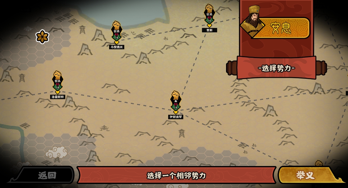 施行张议潮“举义”政策后,王上可选择一个【邻国】与我方首都不相连的非首都城市进行【举义】,有概率直接占领城市。
