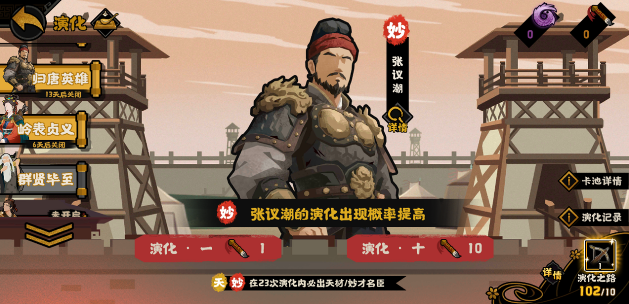 与此同时,11月7日至11月20日。“赖得将军开旧路,一振雄名天下知”全新妙才名臣张议潮演化概率将同步上升!感兴趣的王上不要错过哦!