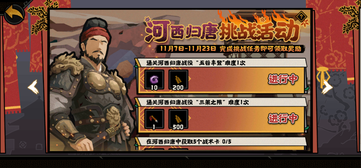 随着全新战役《河西归唐》上线,全新的挑战活动也要开启啦!11月7日至11月23日,完成挑战任务即可获取丰富道具奖励,玄玉、龙须笔、纹石等你来拿!