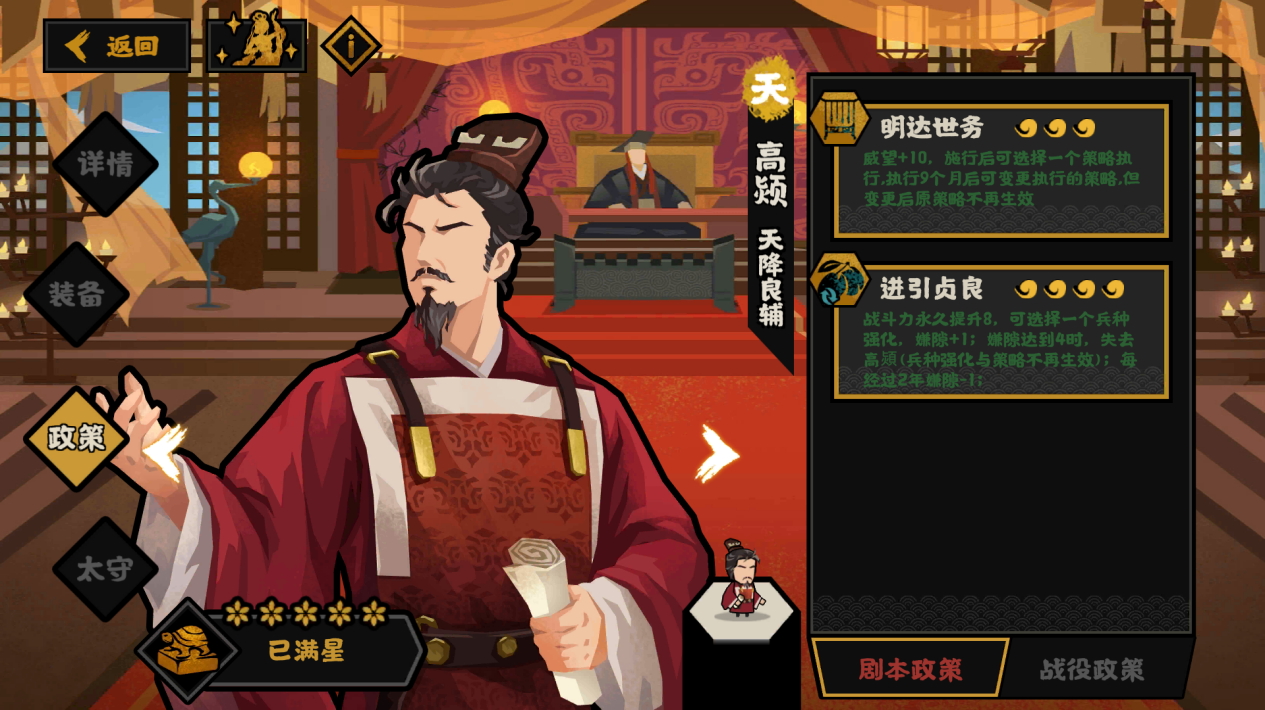 施行高颎“进引贞良”政策后,战斗力永久提升8,与此同时还可选择一个兵种强化,嫌隙+1;嫌隙达到4时,失去高颎(兵种强化与策略不再生效);每经过两年嫌隙-1;王上在施行这个政策的时候,一定要注意当前嫌隙的数值哦~
