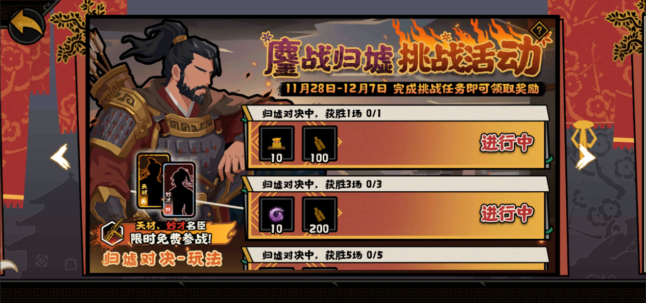 11月28日至12月7日,全新一期鏖战归墟即将开启,天材、妙才名臣限时免费参战!完成对决挑战,即可赢取玄玉、纹石等丰厚奖励,等你来拿!