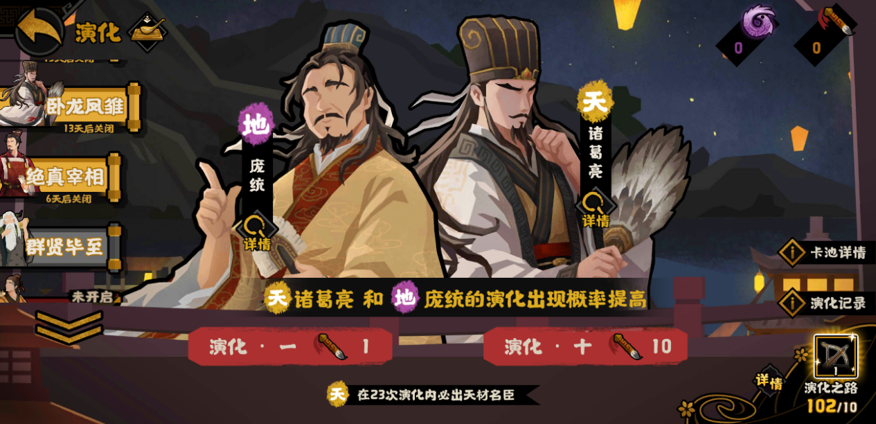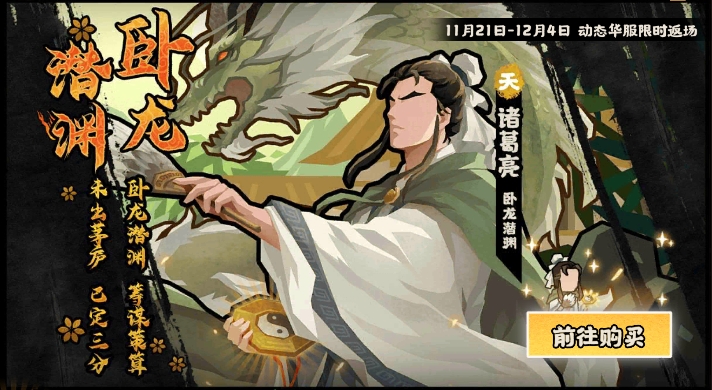 11月21日至12月4日,卧龙羽扇定风云,凤雏折翼落星文。天材名臣·诸葛亮、地贤名臣·庞统演化概率限时上升!