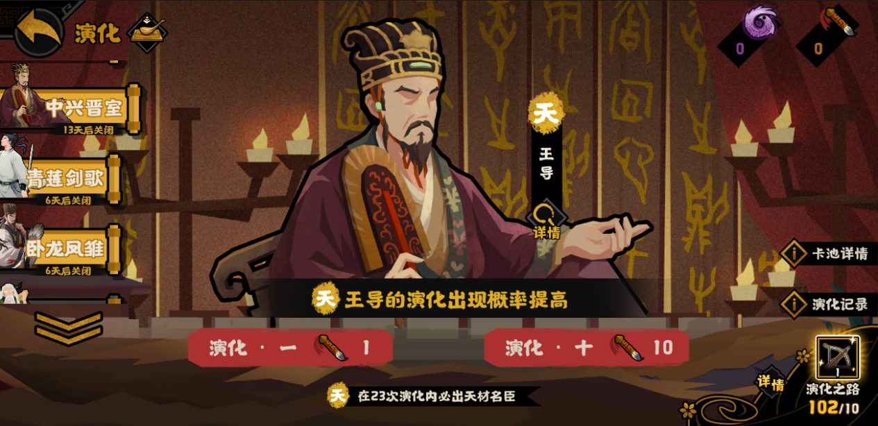 11月28日至12月11日,辅国定策,名垂青史!天材名臣·王导演化概率限时上升!