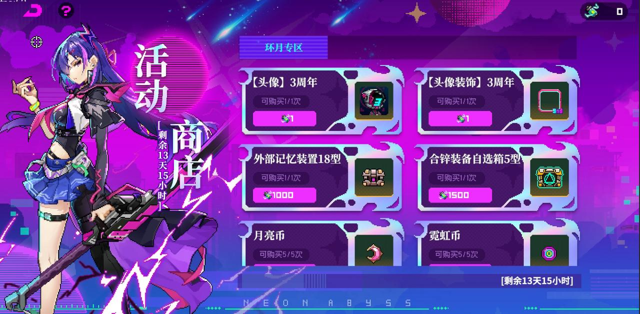 *其中「盈月能量」可用于「活动商店」兑换丰富的道具奖励!3周年限定头像 & 头像框、外部记忆装置18型、合梓装备自选箱5型、蓝色纪念品自选箱、紫色纪念品自选箱、月亮币、霓虹币、孵化舱组合包等你来拿!