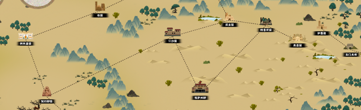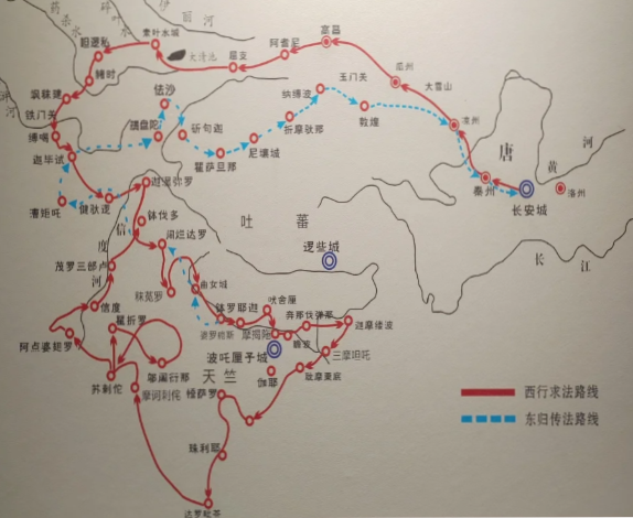 他一路向西,经秦州(今甘肃天水)、兰州、凉州(今甘肃武威)、瓜州(今甘肃瓜州县),冒险越过玉门关、穿越莫贺延大沙漠(今甘肃与新疆交界),抵达伊吾(今新疆哈密)。