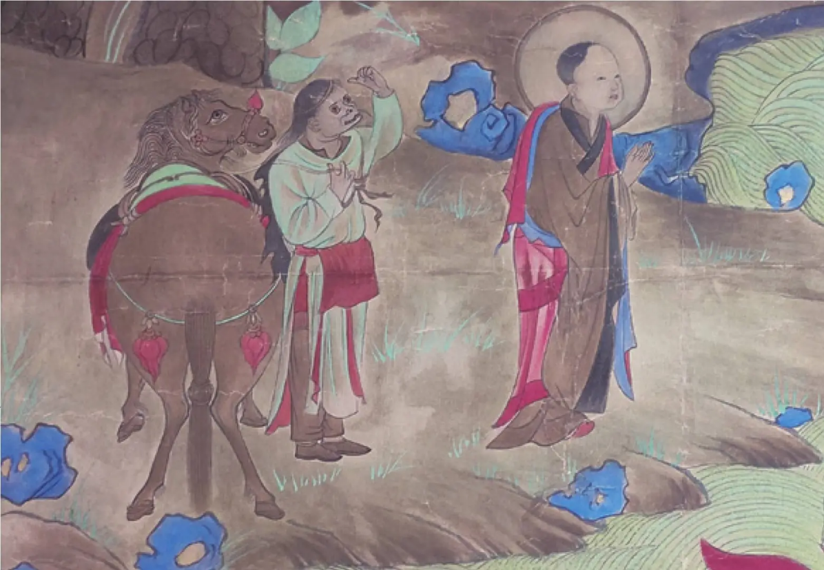 在瓜州时,玄奘还遇到了第一个改变他西行命运的人——粟特商人石磐陀。据传,石磐陀就是《西游记》中孙悟空的原型。作为行走丝绸之路的商人,石磐陀也信仰佛教。在当时摩顶授戒,是丝绸之路商人的最高精神追求。因此石磐陀尾随着玄奘,要求受戒为弟子,陪伴玄奘西行,并赠送了玄奘一匹枣红色的老马。这匹老马可以让玄奘在沙漠中找到绿洲,于是二人结伴,计划由葫芦河绕行玉门关前往西域。