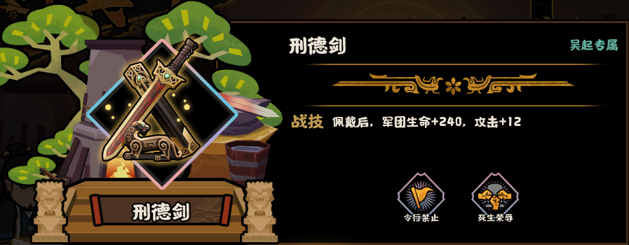 刑德剑技能“生死荣辱”:初始友军阵亡时,在原地召唤1队【魏武卒】;