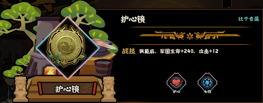 护心镜战技:佩戴后,军团生命+240,攻击+12;