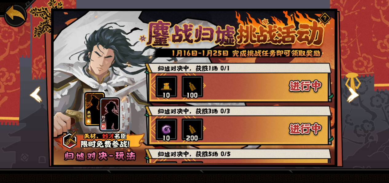 归墟战场,风云再起!1月16日至1月25日,全新一期鏖战归墟即将开启,天材、妙才名臣限时免费参战!完成对决挑战,即可赢取玄玉、纹石等丰厚奖励,等你来拿!