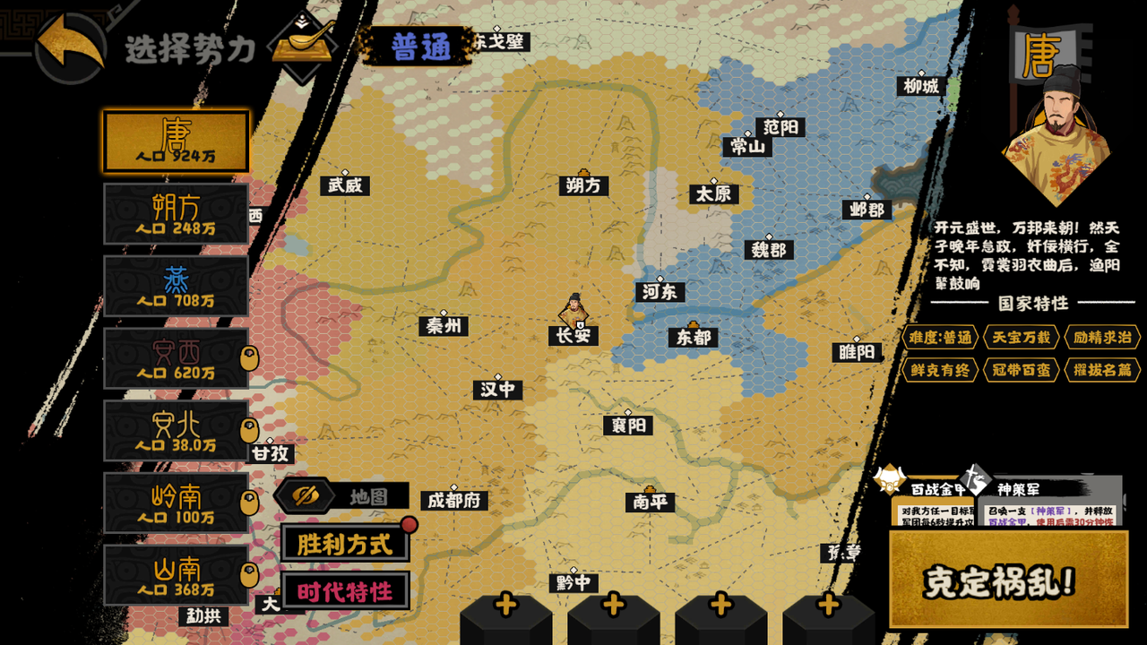 其次是以枭雄安禄山的身份开局,手握大唐最精锐的边军,目标直指两京,誓要取而代之。河北根据地并不稳固,王上要如何平衡前线猛攻与后方维稳?可否一连串胜利碾压唐廷抵抗,以防陷入拉锯战?