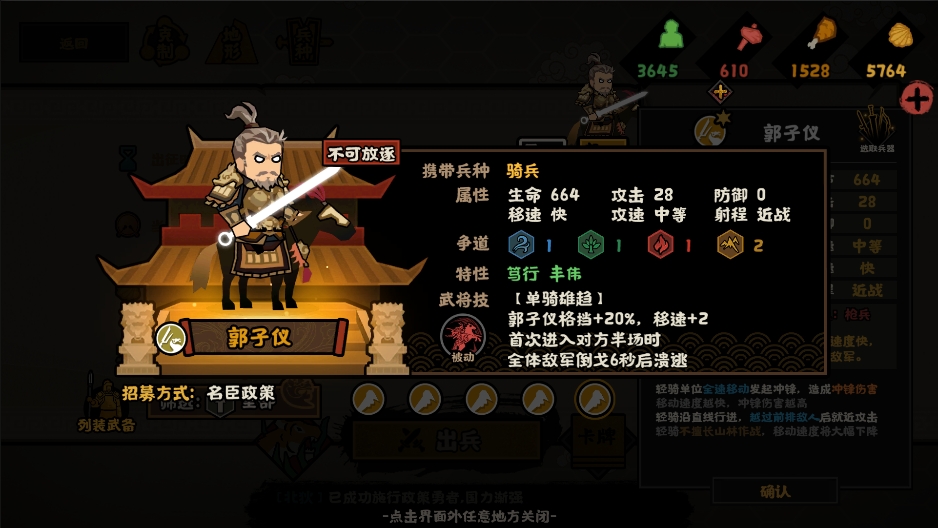 【回马箭】:轻骑、弓骑撤退,一段时间后在目标地点造成伤害