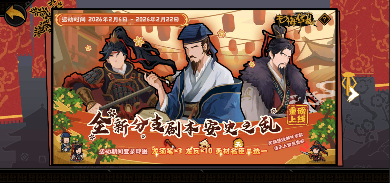每一次重大征程的开启,我们都准备了丰厚的助力。2月6日剧本上线的同时,全新登录礼也将一同上线!天材名臣自选箱(霍去病、王羲之、荀彧)、龙须笔*3、龙瓦*10等待王上前来领取,还有春节签到、剧本挑战、好友邀请等丰富活动与福利~
