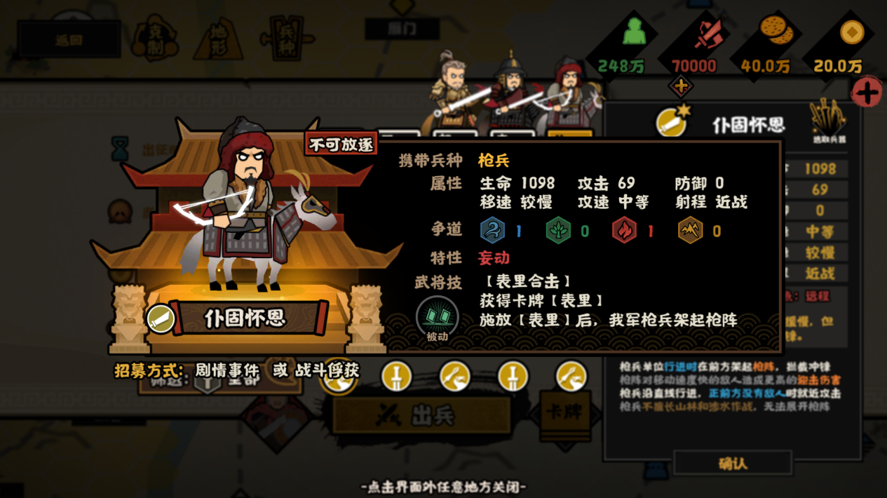 5、【万里摧烽】:进攻威望不足40的国家时,可用卡牌回纥援军,【借兵回纥】后武将【叶护太子】可上阵获得菩萨劲勇