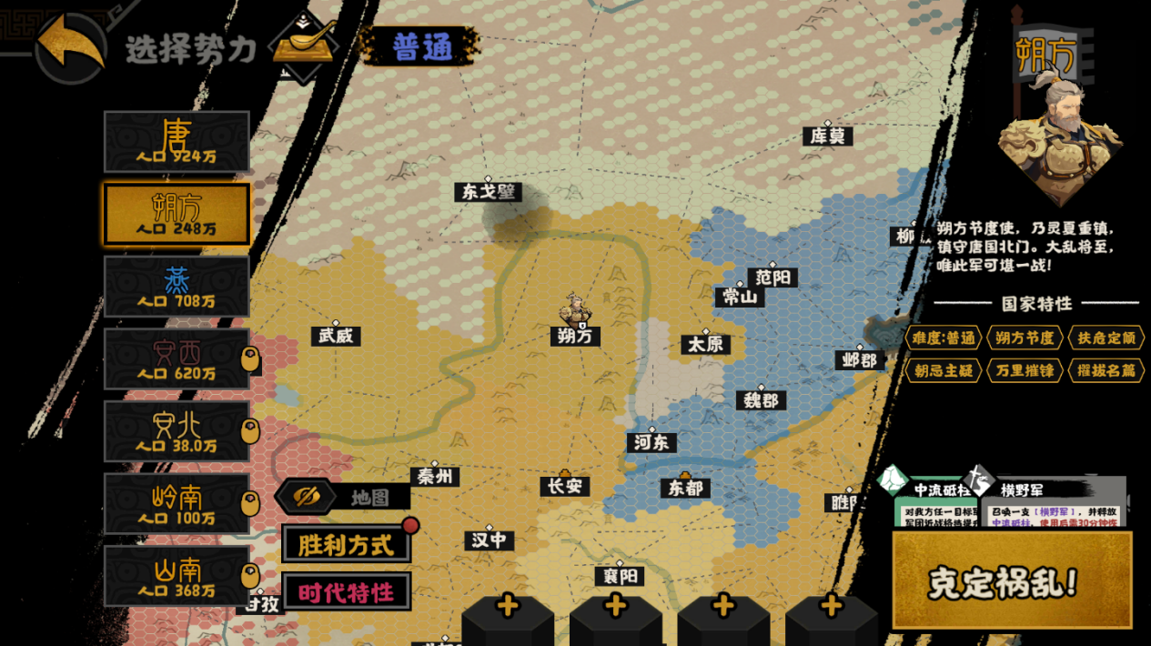 2、【朔方度使】:初始【唐】节度使,可在剧情事件中招募郭子仪,武将李光弼、仆固怀恩上阵,对其他势力归化倾向+80;