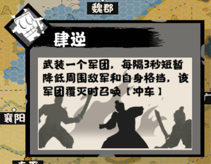 武装一个军团,每隔3秒短暂降低周围敌军和自身格挡,该军团覆灭时召唤【冲车】
