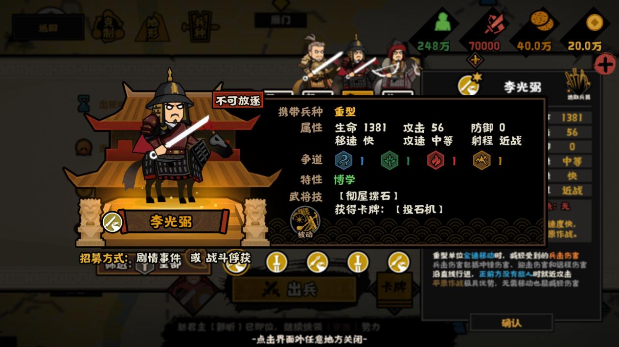 4、【鲜克有终】:民心达到60时,可用卡牌破阵。若民心不足30,每年结束时损失15%钱粮;
