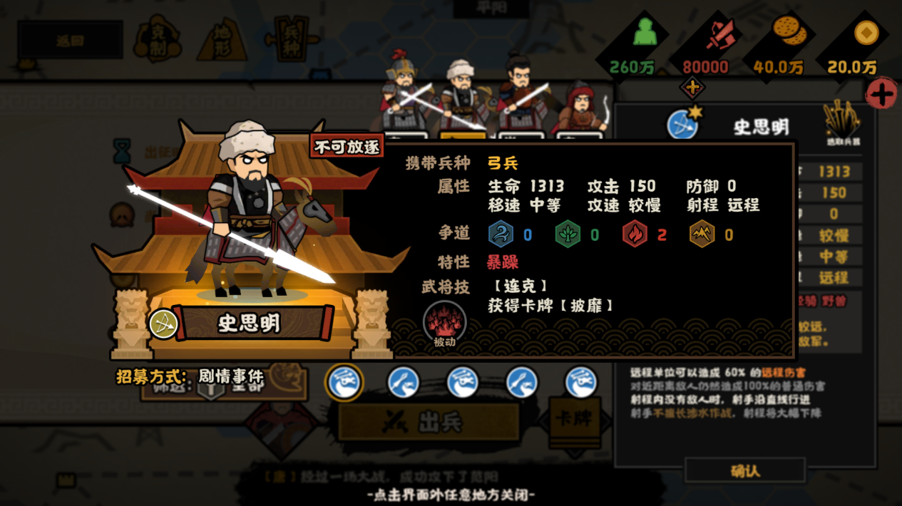 2、【雄武皇帝】:初始为【唐】叛乱的节度使,武将安禄山、史思明、崔乾佑、安庆绪可上阵,对其他势力归化倾向-80;