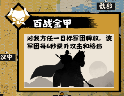 对我方任一目标军团释放,该军团每6秒提升攻击和格挡;