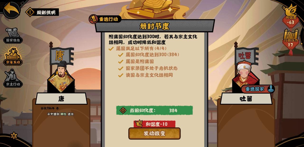 安史之乱的根源,在于节度使制度的失控。本次剧本引入全新节度使界面,王上可以在国家集团界面任命、调遣节度使。赋予其权力,也要警惕其忠诚与野心。驾驭他们,是利用地方力量中兴的关键,也是对所有君主的终极统治考验。