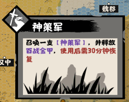 召唤一只【神策军】,并释放百战金甲,使用后需30分钟恢复;