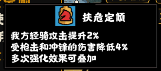 扶危定倾:我方轻骑攻击提升2%,受枪击和冲锋的伤害降低4%,多次强化效果可叠加