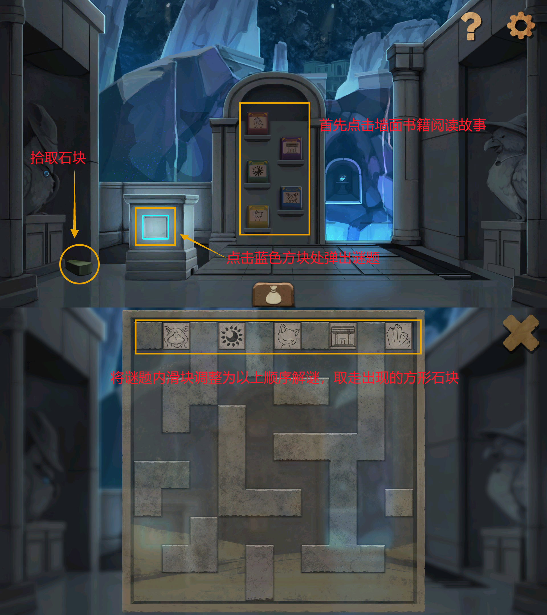 点击发光蓝色方块,将石块调整为图示顺序解开谜题,取出方形石块。